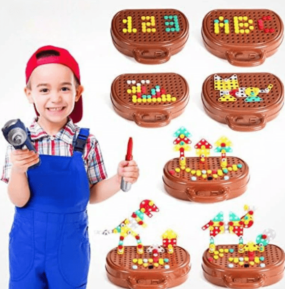 Avec plus de 200 pièces colorées (écrous, vis, formes géométriques…), ce kit stimule la motricité fine, la concentration et la créativité des enfants dès 3 ans.