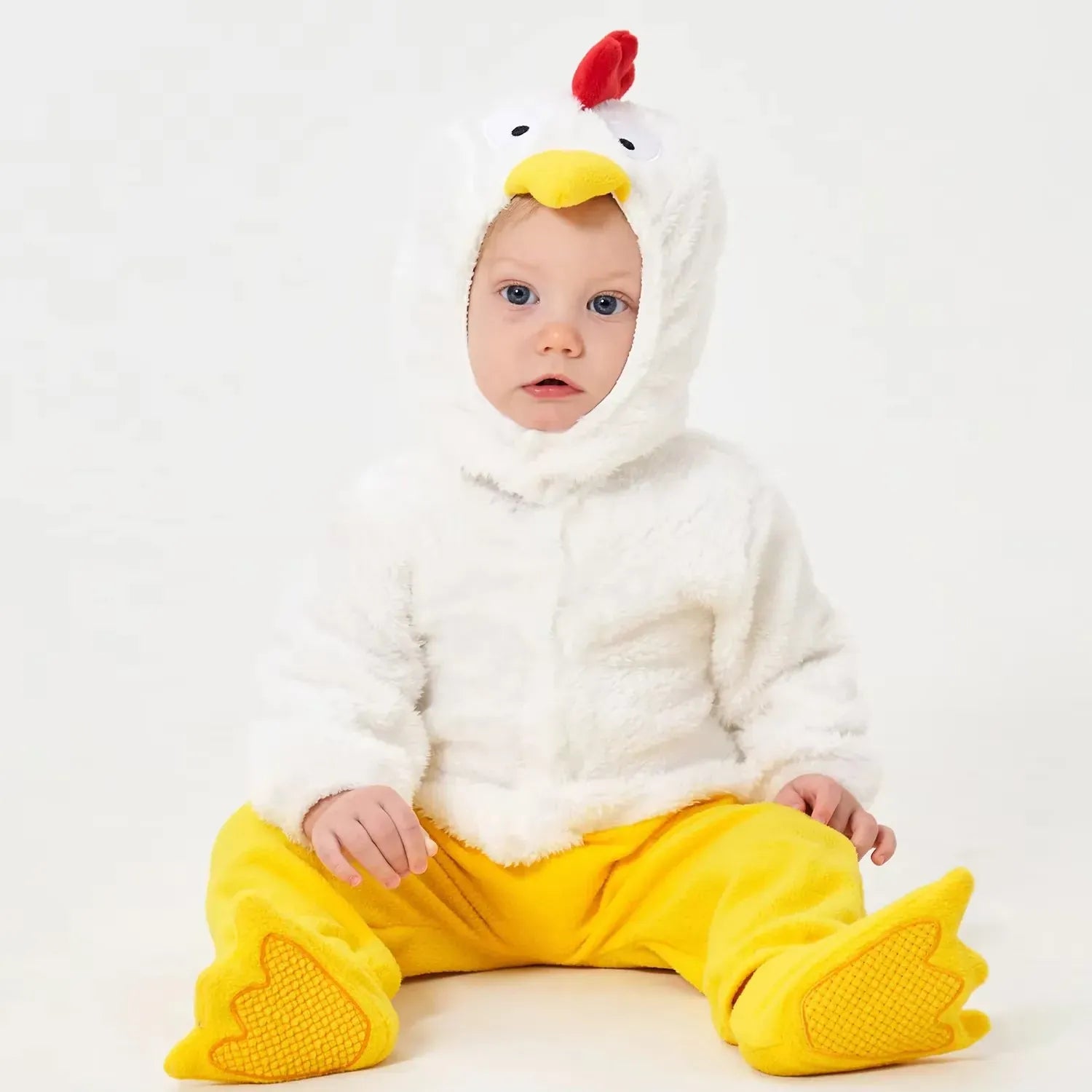 Design réaliste : Le déguisement de poussin comprend des détails réalistes, y compris un chapeau en forme de tête de poussin et des chaussures assorties pour un look cohérent et mignon.