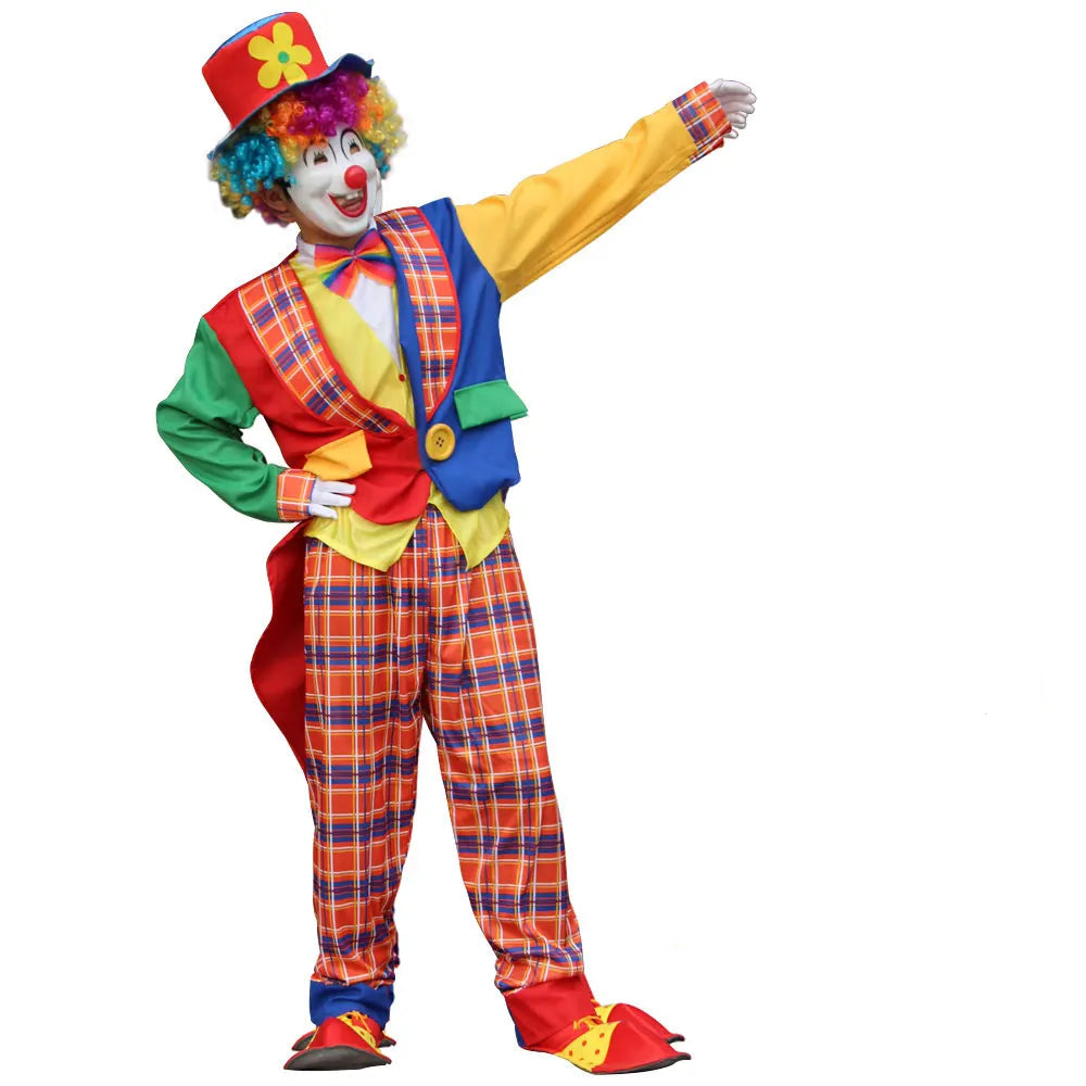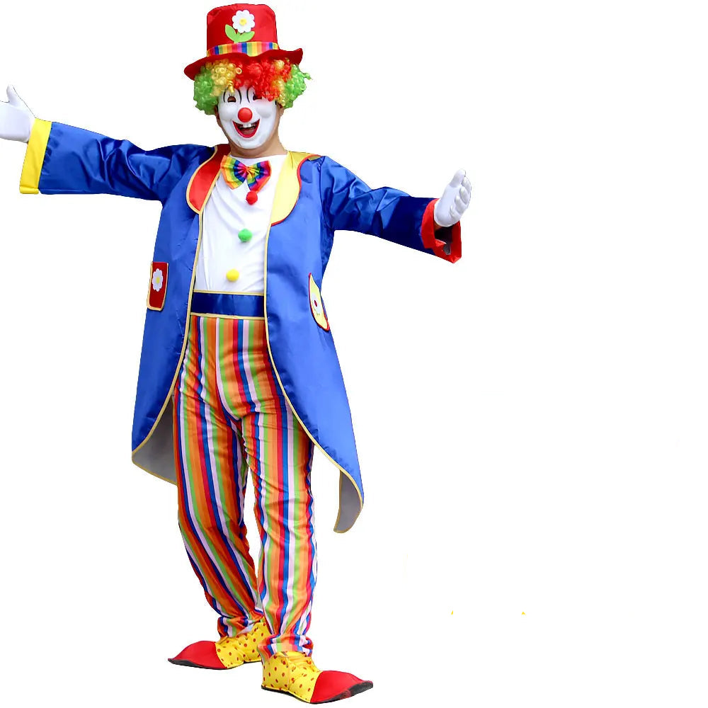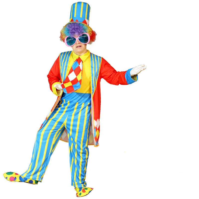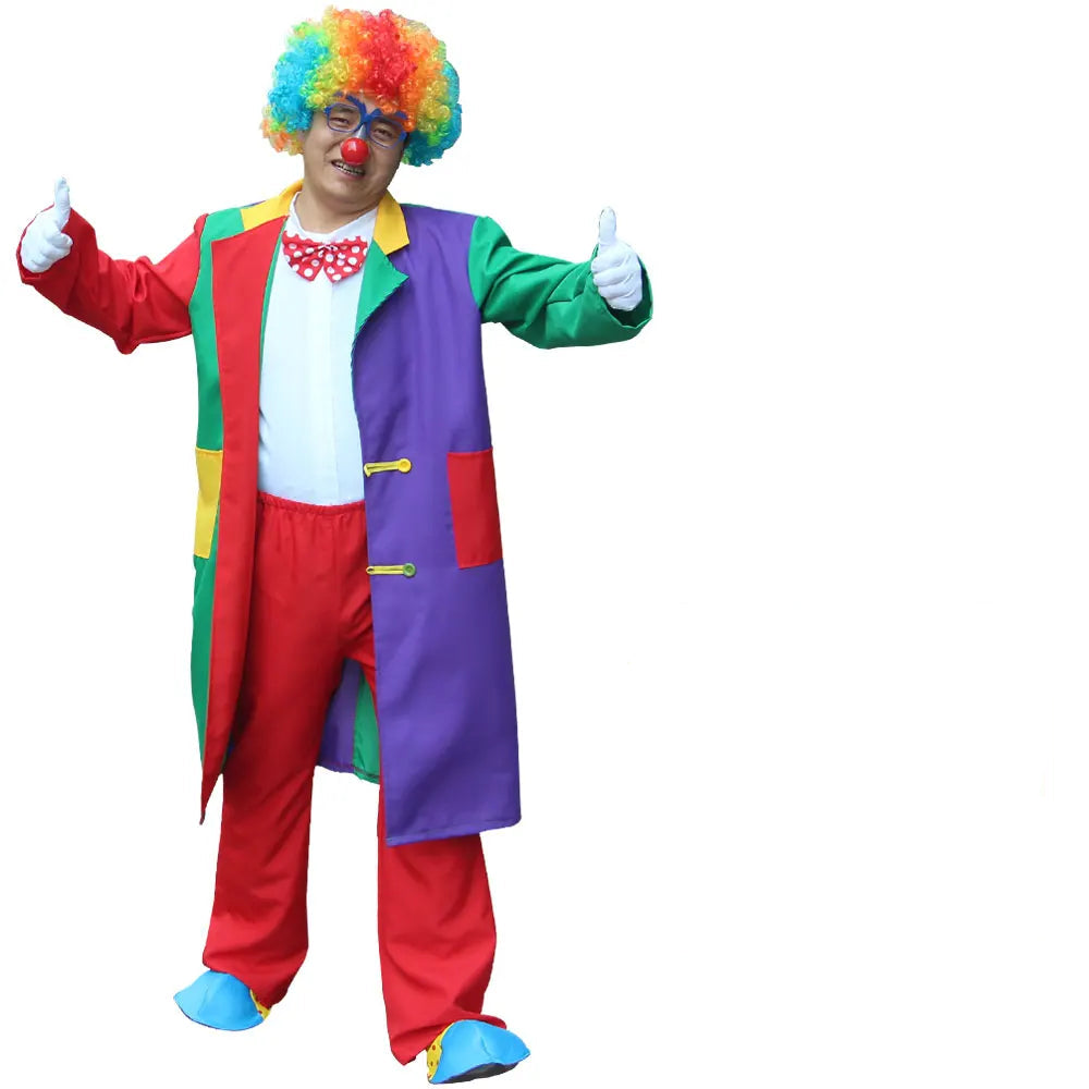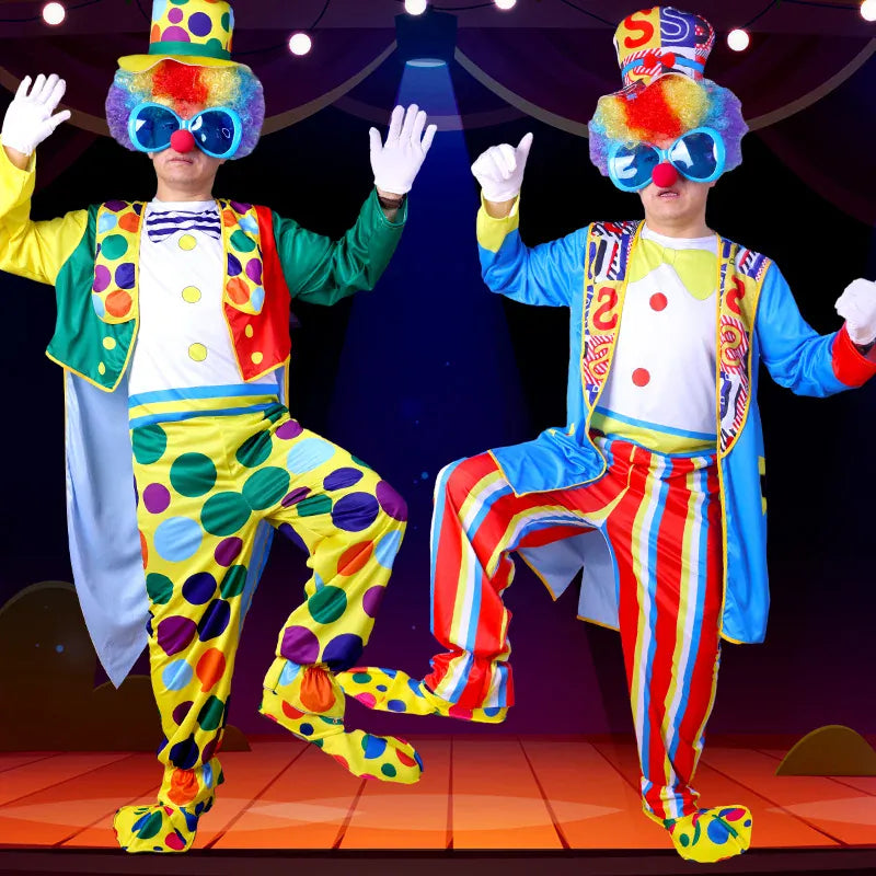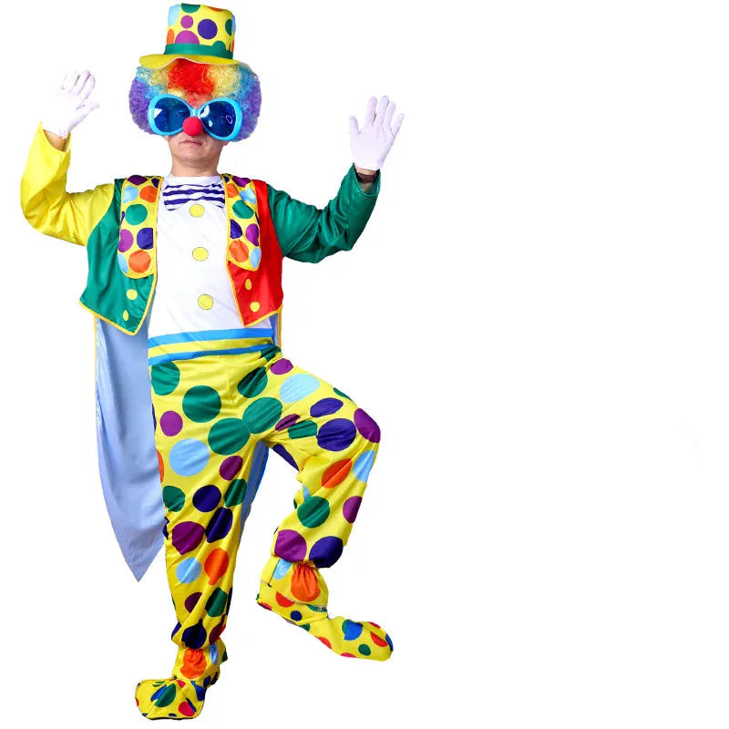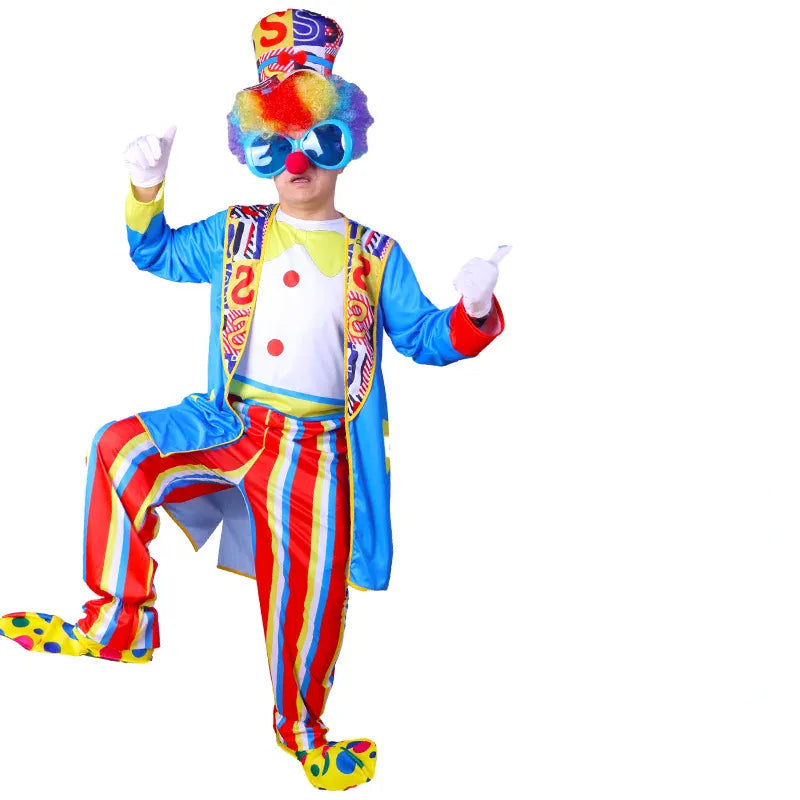 Déguisement de clown adulte coloré – idéal pour spectacles de scène, animations de fête, carnaval ou Halloween.