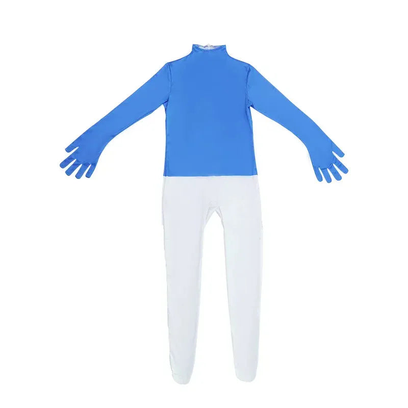 • Costume complet : combinaison bleue moulante + bonnet blanc classique.